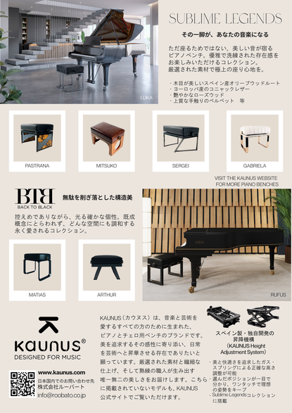 KAUNUS (カウヌス)は、音楽と芸術を愛するすべての方のために生まれた、ピアノとチェロ用ベンチのスペイン産ブランドです。厳選された素材と繊細な仕上げ、そして熟練の職人が生み出す唯一無二の美しさをお届けします。